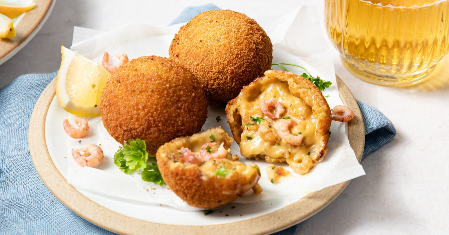 - Les croquettes de crevettes sont prêtes. Placez-les au congélateur pour plus tard ou cuisez-les directement à la friteuse pendant 4-5 minutes à 180 °C. Dégustez les croquettes accompagnées de persil frit et d’un demi citron. Bon appétit !
