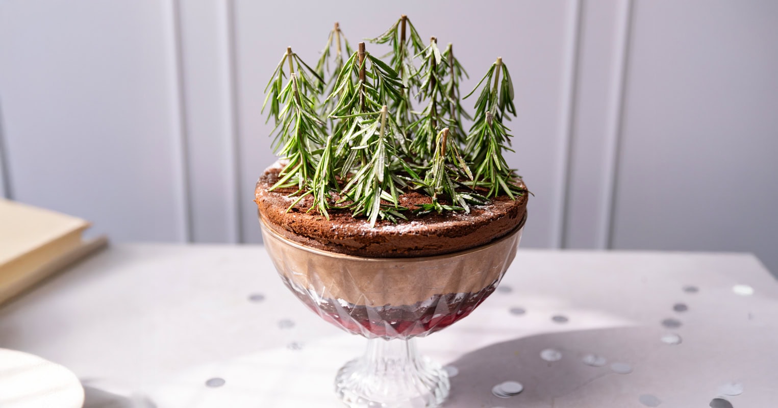 - Laissez reposer le dessert au réfrigérateur au moins 1 heure avant de servir pour que les saveurs s’imprègnent. Au moment de servir, piquez les brins de romarin dans le cake au chocolat du dessus pour rappeler une forêt de sapins. Vous pouvez aussi saupoudrer les brins de sucre glace pour un effet enneigé féerique. Bon appétit !