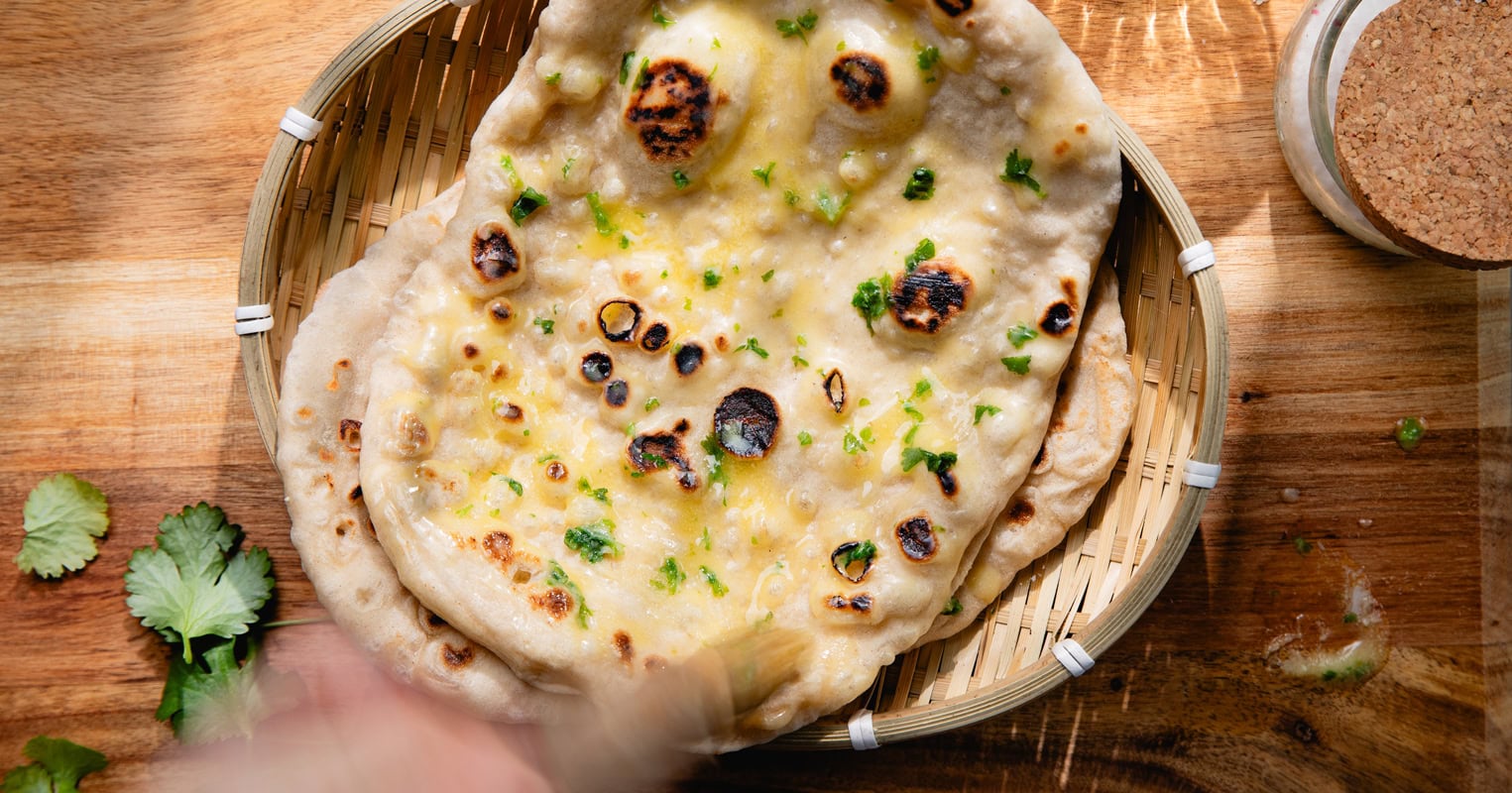 La pâte se compose de farine, d’eau, de yaourt, de levure et de sel. Le yaourt apporte le moelleux et cette légère acidité qui fait toute la différence. Le beurre ou le ghee viennent en finition, souvent associés à de la coriandre ciselée ou à de l’ail.