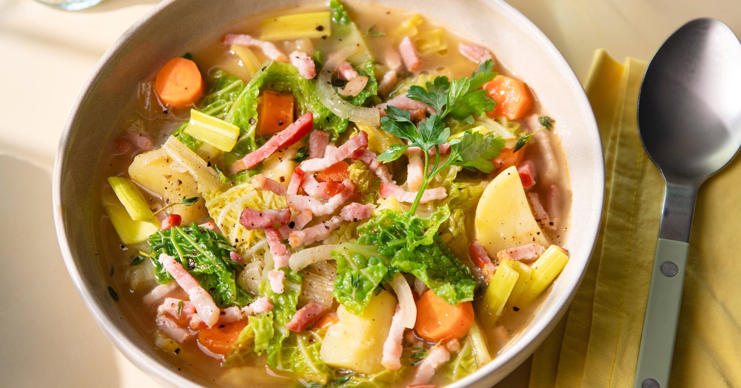La soupe au chou frisé fait partie de ces recettes qui ont traversé les régions et les époques. On la retrouve dans différentes cultures européennes, souvent associée aux légumes racines, aux potagers d’hiver et aux soupes qui mijotent longtemps. Ici, on opte pour une version composée de chou frisé, navets, carottes, poireaux et pommes de terre, avec un petit plus gourmand : des lamelles de lard croustillantes ajoutées juste avant le service.