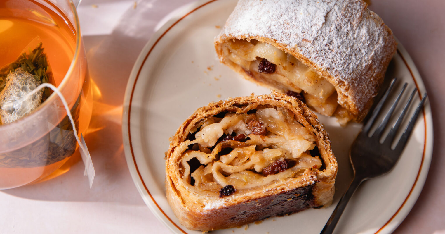 Originaire d’Autriche, popularisé dans l’empire austro-hongrois, l’apfelstrudel a voyagé depuis les salons viennois jusqu’aux tables de brunch les plus fancy. Sa confection est un peu technique, mais pas inatteignable : une pâte étirable, étendue sur un torchon, si fine qu’on distingue le motif en dessous. Ensuite, on la garnit, on roule et on enfourne.